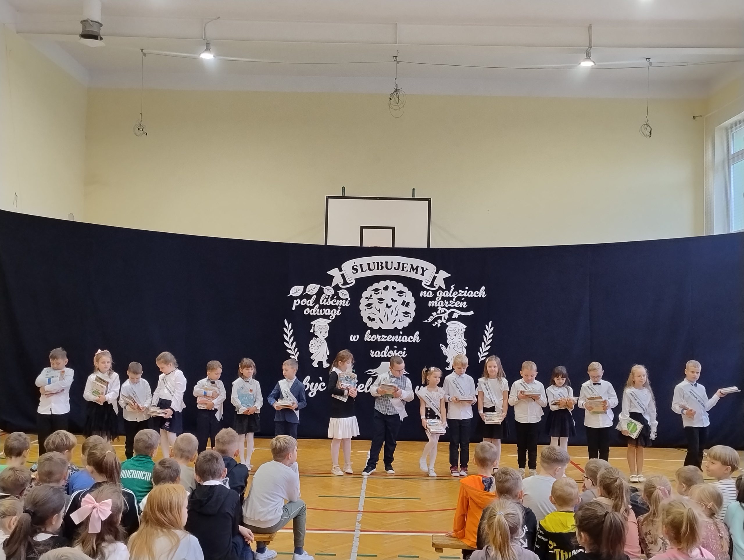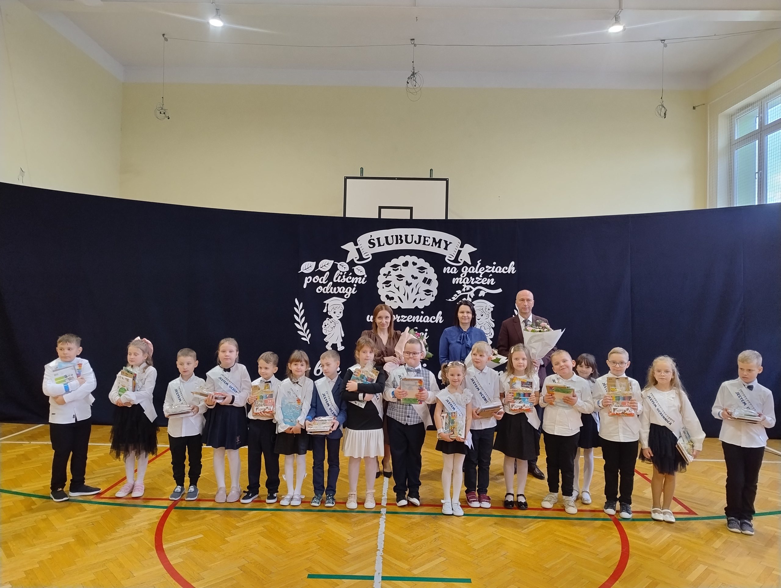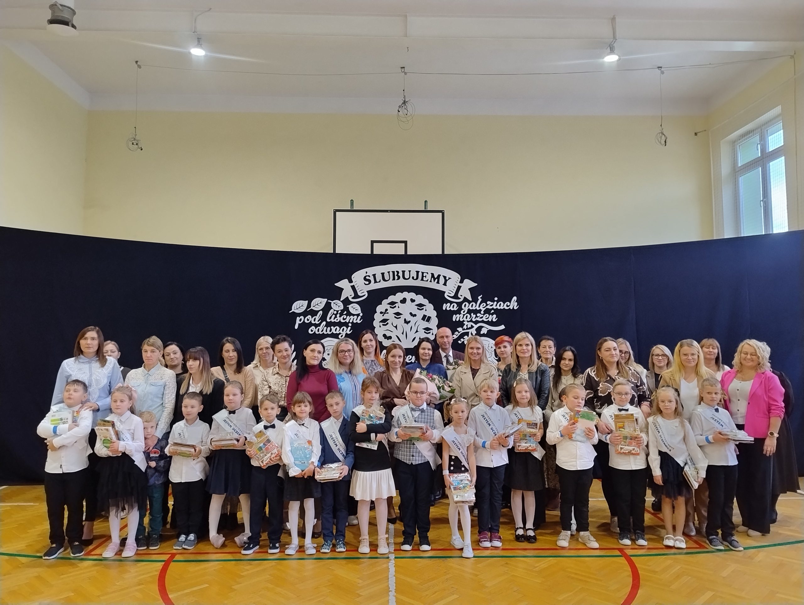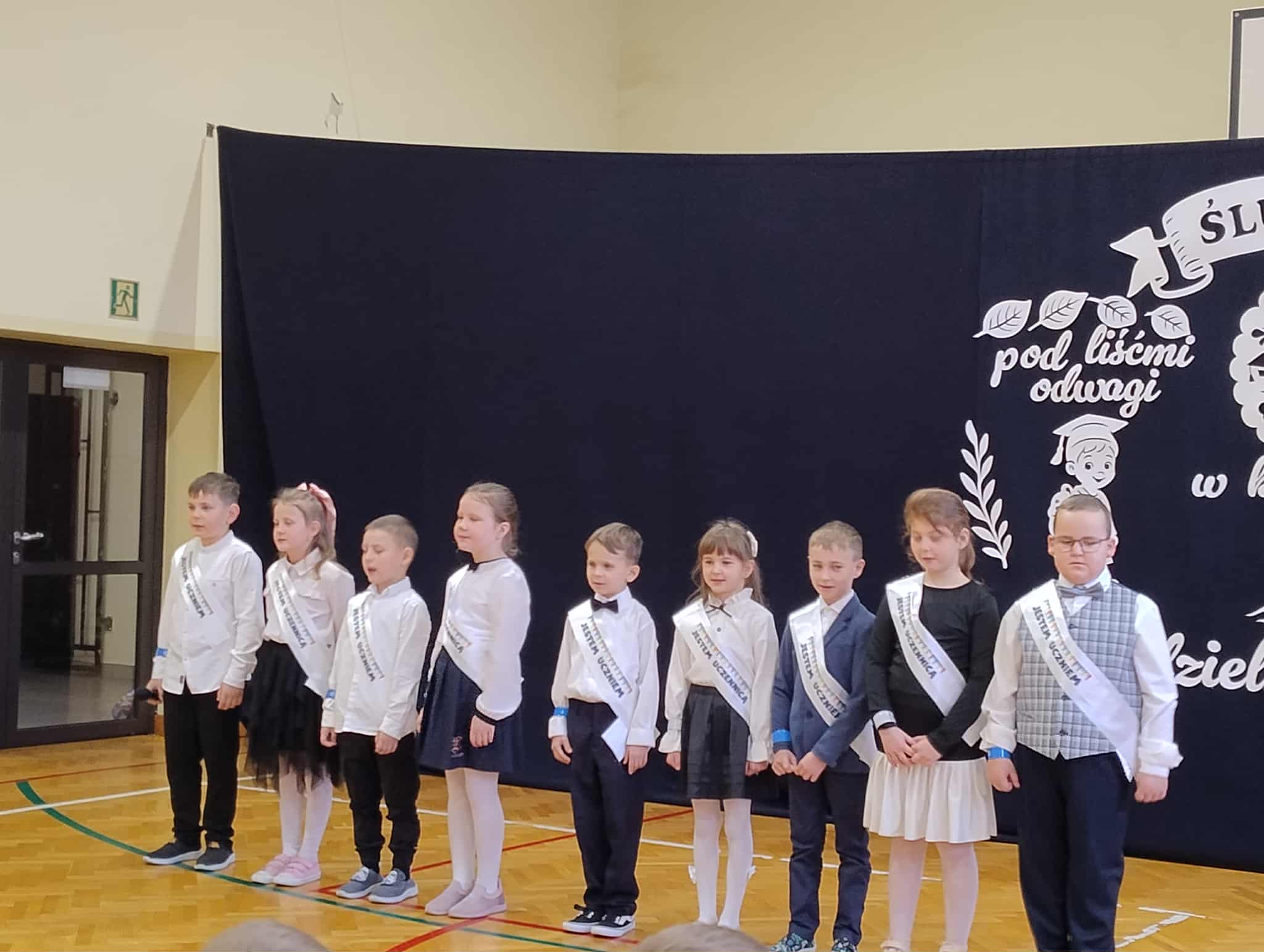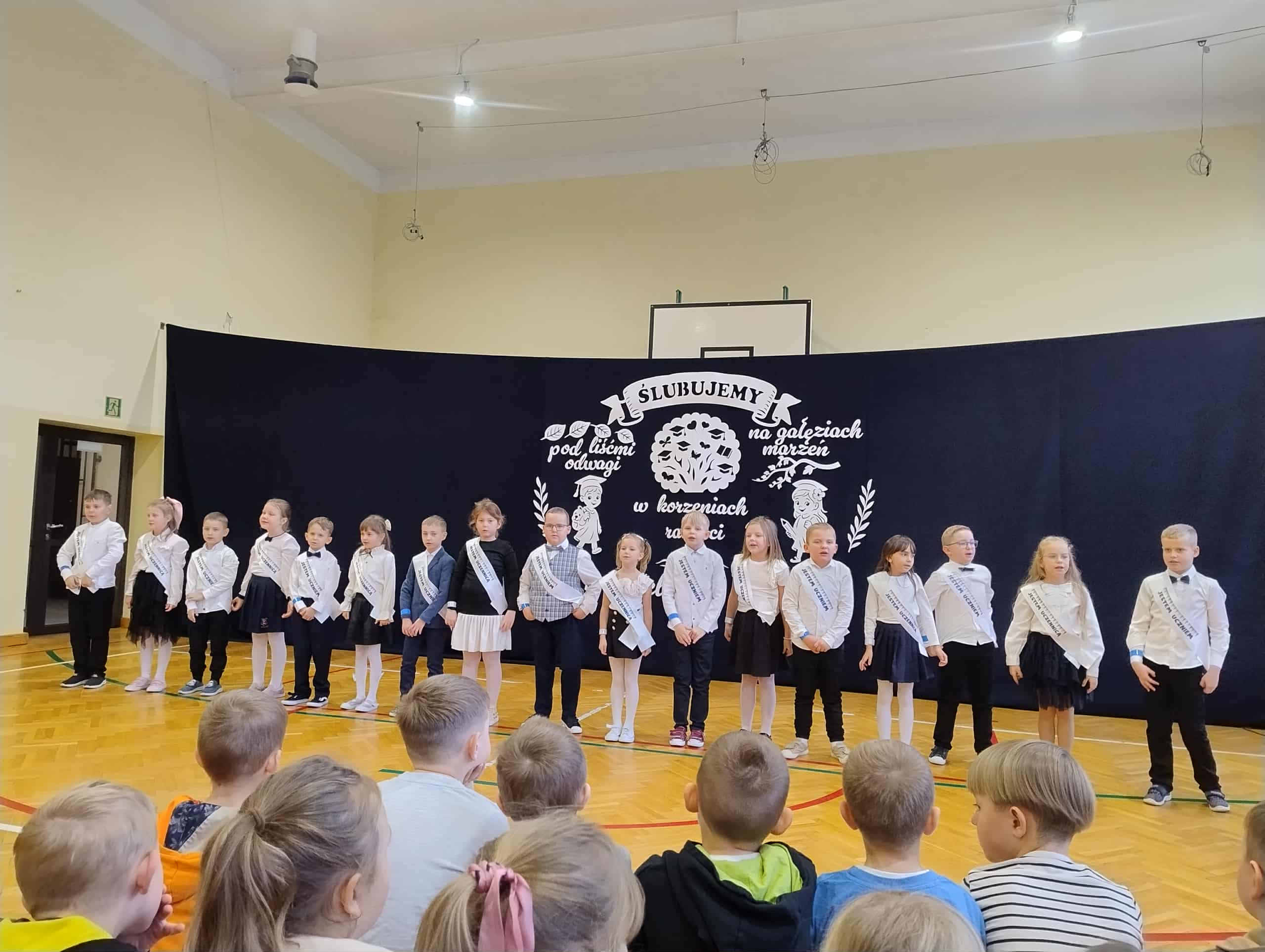 23 października w naszej szkole odbyło się uroczyste ślubowanie klasy I. To wyjątkowa uroczystość, przyjęcie najmłodszych w poczet uczniów . Był to pierwszy występ dzieci na szkolnej scenie, ale poradzili sobie znakomicie. Tego dnia nie mogło zabraknąć muzyki, tańca i wierszy. Następny punkt programu ślubowanie oraz pasowanie na ucznia przebiegło w bardzo uroczystej atmosferze. Uczniowie zachowali się godnie oraz otrzymali pamiątkowe dyplomy i upominki. Tak upłynął ten wyjątkowy dzień. Gratulujemy uczniom oraz dziękujemy ich najbliższym za pomoc w przygotowaniach do ślubowania.